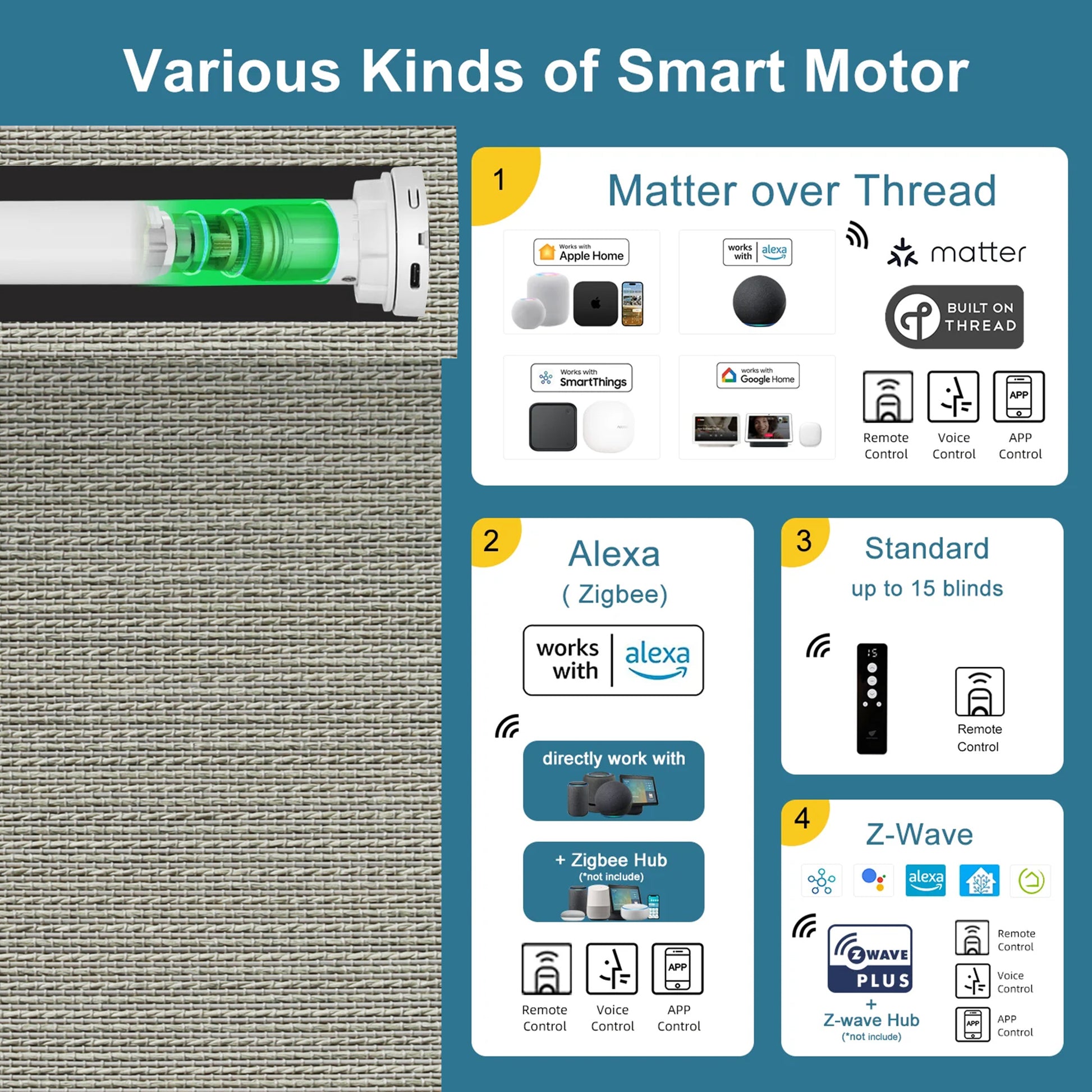 The highlight of our collection is the Matter motor, which represents the forefront of smart shade technology. Utilizing the Matter over Thread protocol, it seamlessly connects with major platforms such as Apple HomeKit, Amazon Alexa, Samsung SmartThings, and Google Assistant. This motor allows for intuitive control from your preferred app, providing faster response times, stable connections, and enhanced data security.