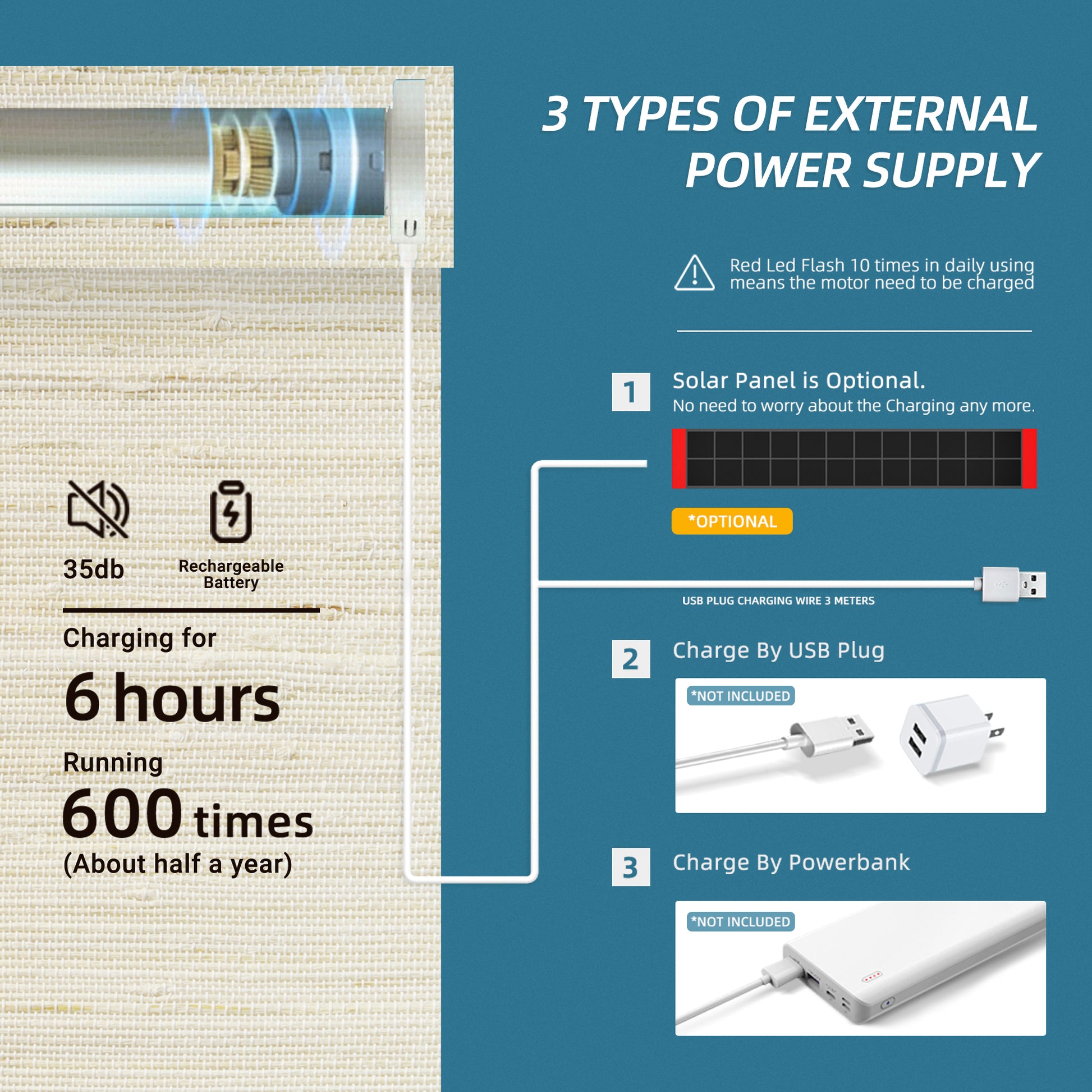 SmartWings shades feature a rechargeable motor that operates for 4-6 months on a full charge. Recharge them effortlessly using a Type-C cable or a solar panel for continuous convenience.