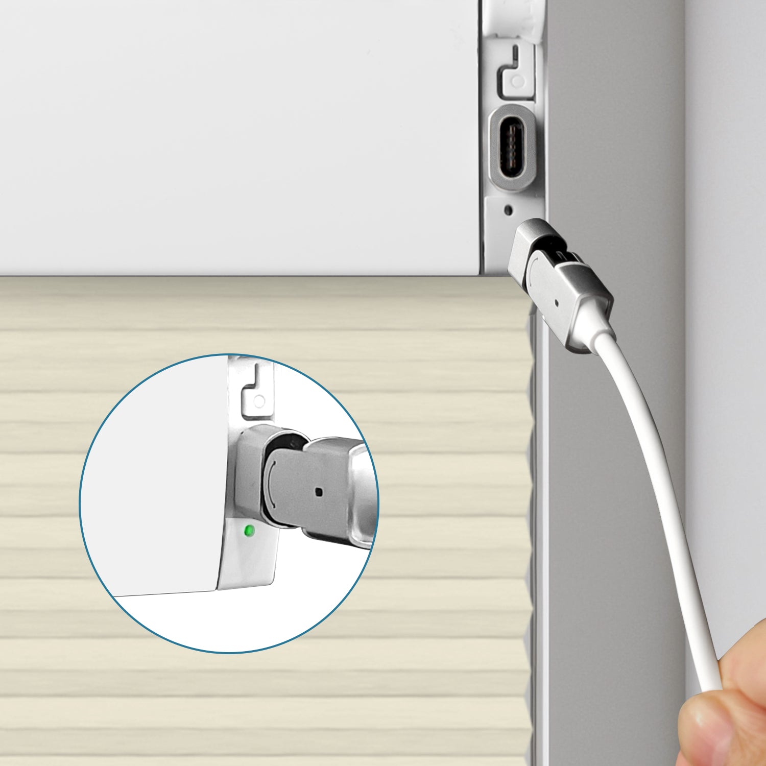 A magnetic charging solution designed for your smart blinds. Keep the magnetic connector plugged into the shade’s Type-C port—when it’s time to charge, simply bring the cable close to the connector and it will snap into place automatically. Once fully charged, just pull gently to detach.