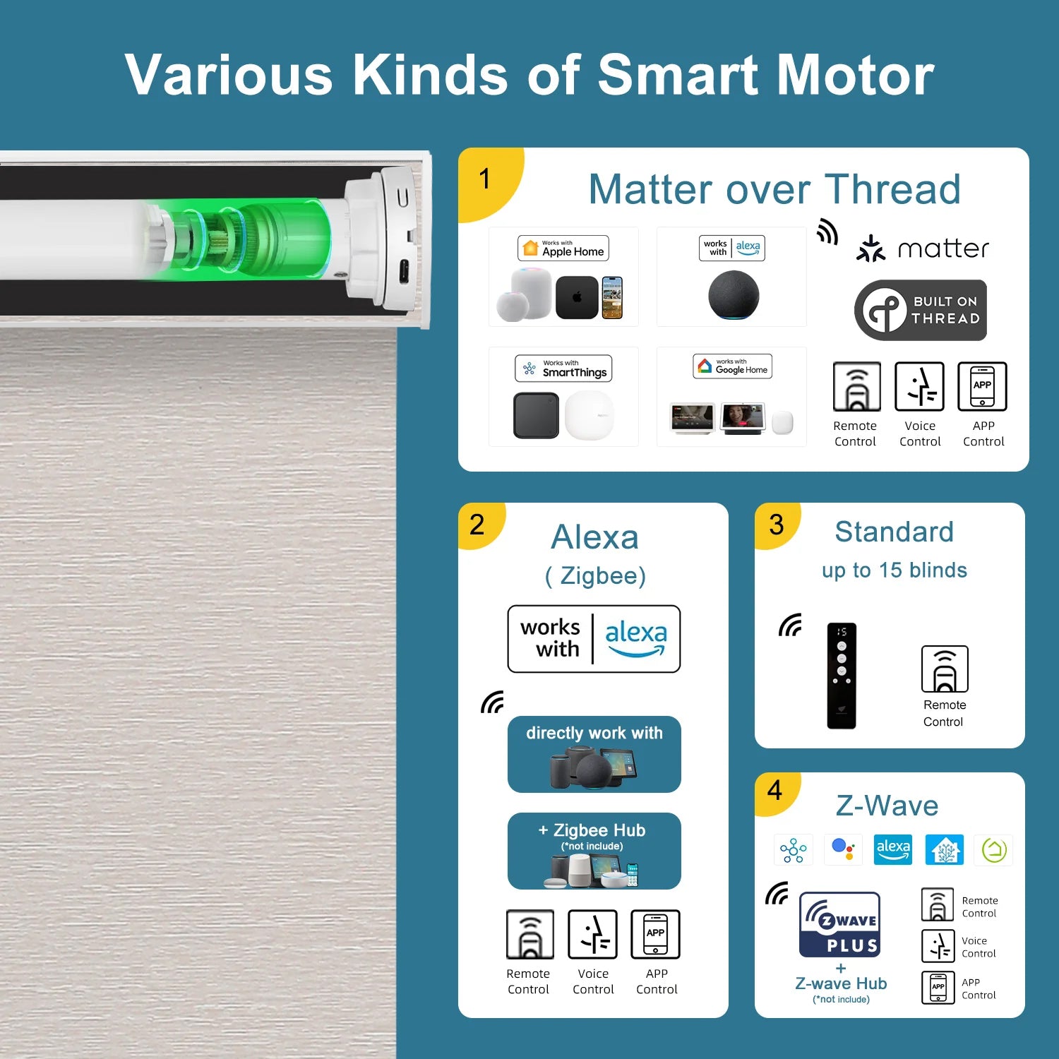 Compatible Motor Options: Standard, Zigbee, Z-wave, Homekit over Thread, Matter over Thread