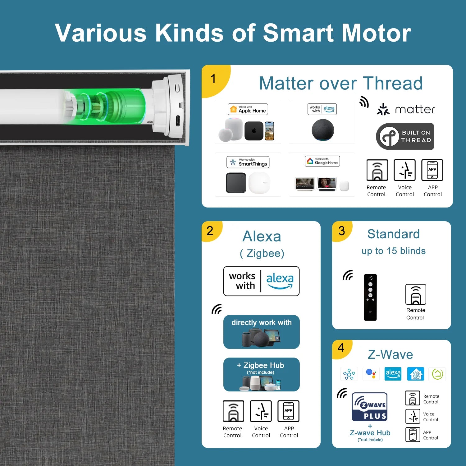 Compatible Motor Options: Standard, Zigbee, Z-wave, Homekit over Thread, Matter over Thread