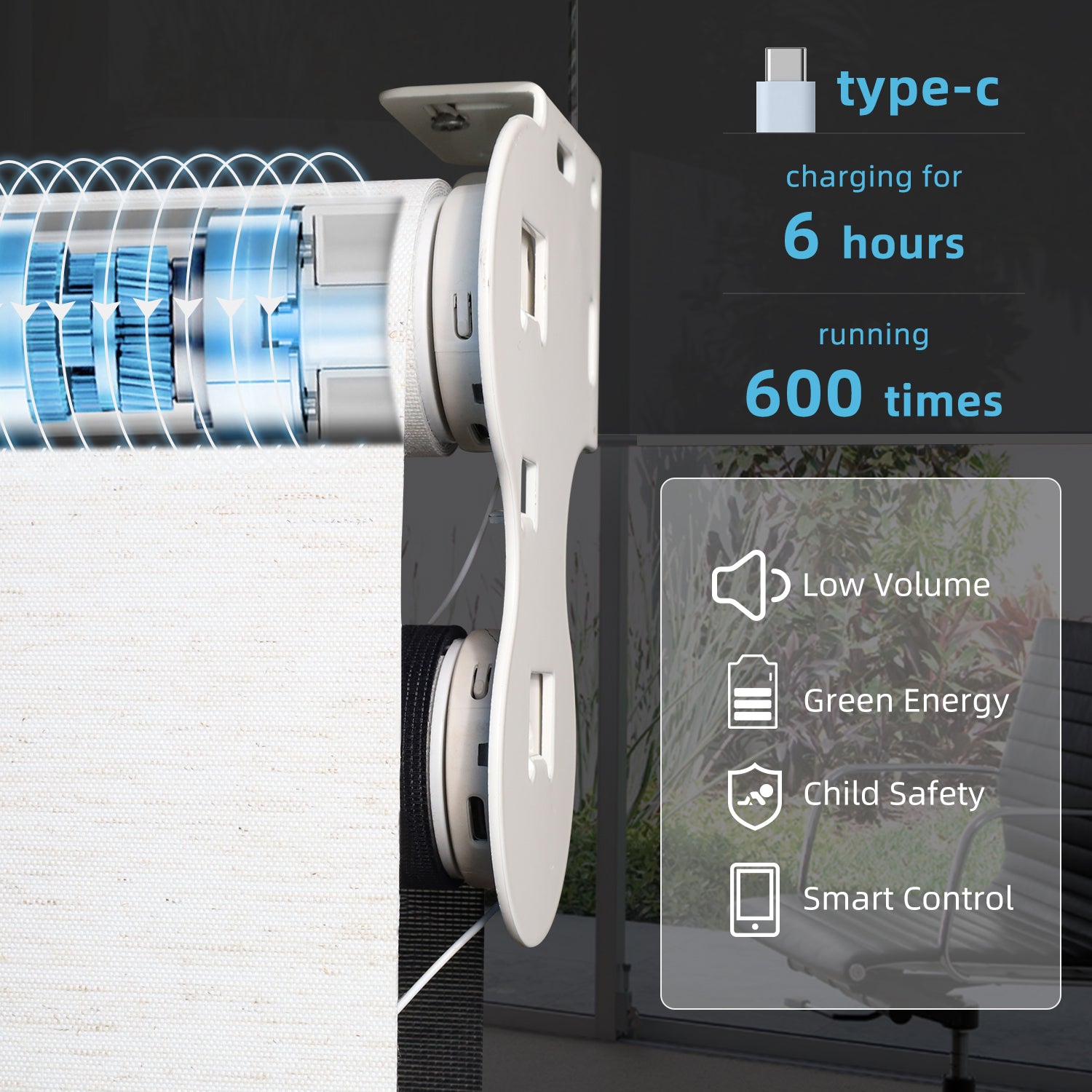 SmartWings shades feature a rechargeable motor that operates for 4-6 months on a full charge. Recharge them effortlessly using a Type-C cable or a solar panel for continuous convenience.