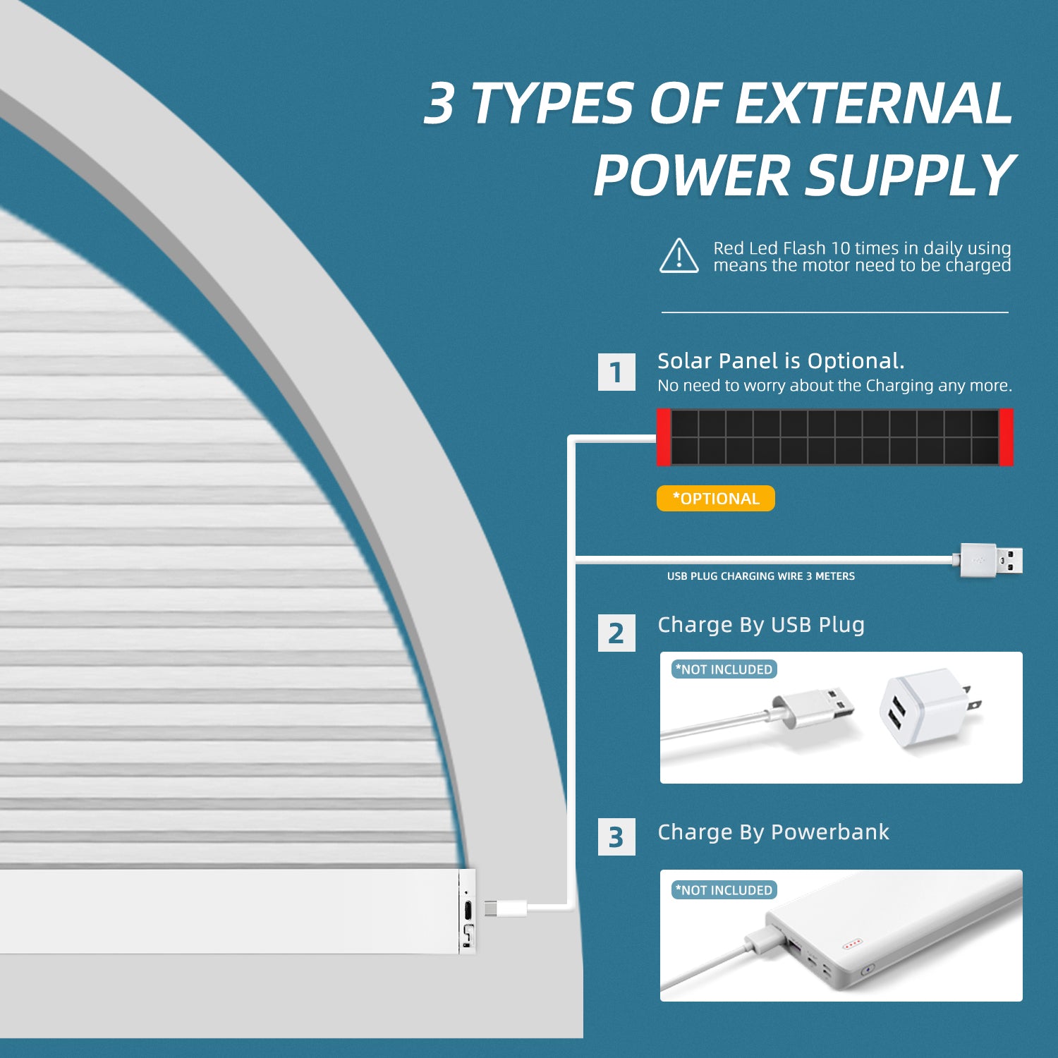 SmartWings shades feature a rechargeable motor that operates for 4-6 months on a full charge. Recharge them effortlessly using a Type-C cable or a solar panel for continuous convenience.