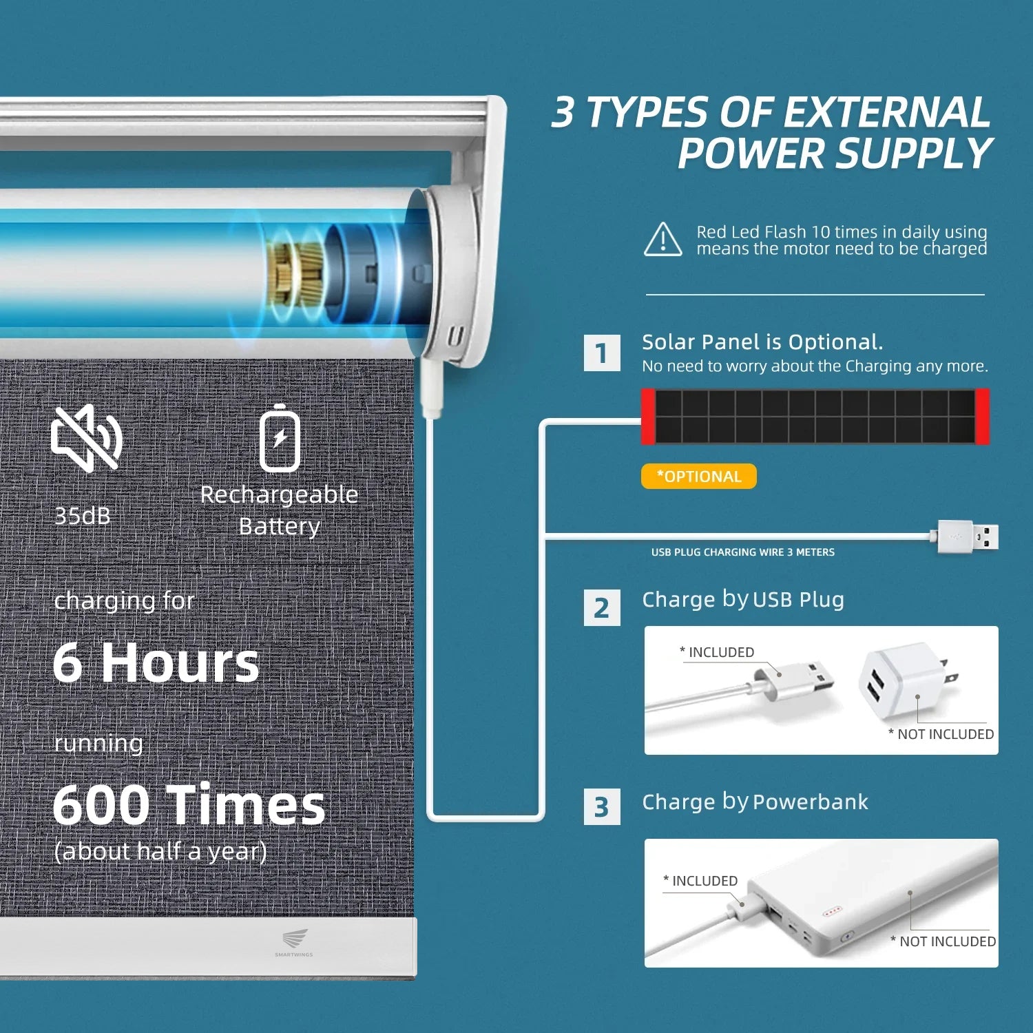 SmartWings shades feature a rechargeable motor that operates for 4-6 months on a full charge. Recharge them effortlessly using a Type-C cable or a solar panel for continuous convenience.