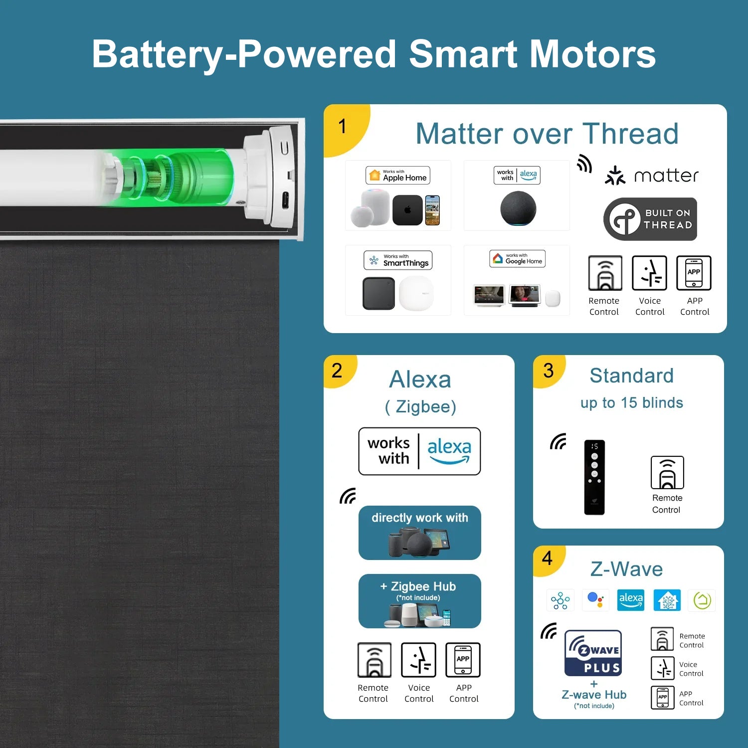 The highlight of our collection is the Matter motor, which represents the forefront of smart shade technology. Utilizing the Matter over Thread protocol, it seamlessly connects with major platforms such as Apple HomeKit, Amazon Alexa, Samsung SmartThings, and Google Assistant. This motor allows for intuitive control from your preferred app, providing faster response times, stable connections, and enhanced data security.
