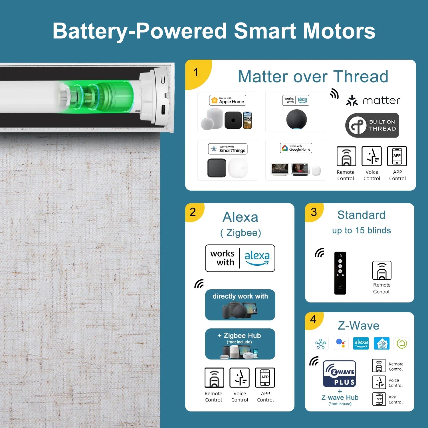 Explore our versatile range of motor options for smart shades, designed to integrate with various smart home platforms. Our Zigbee and Z-Wave motors are compatible with popular systems like Samsung SmartThings, Home Assistant, and Hubitat, ensuring easy integration and control.