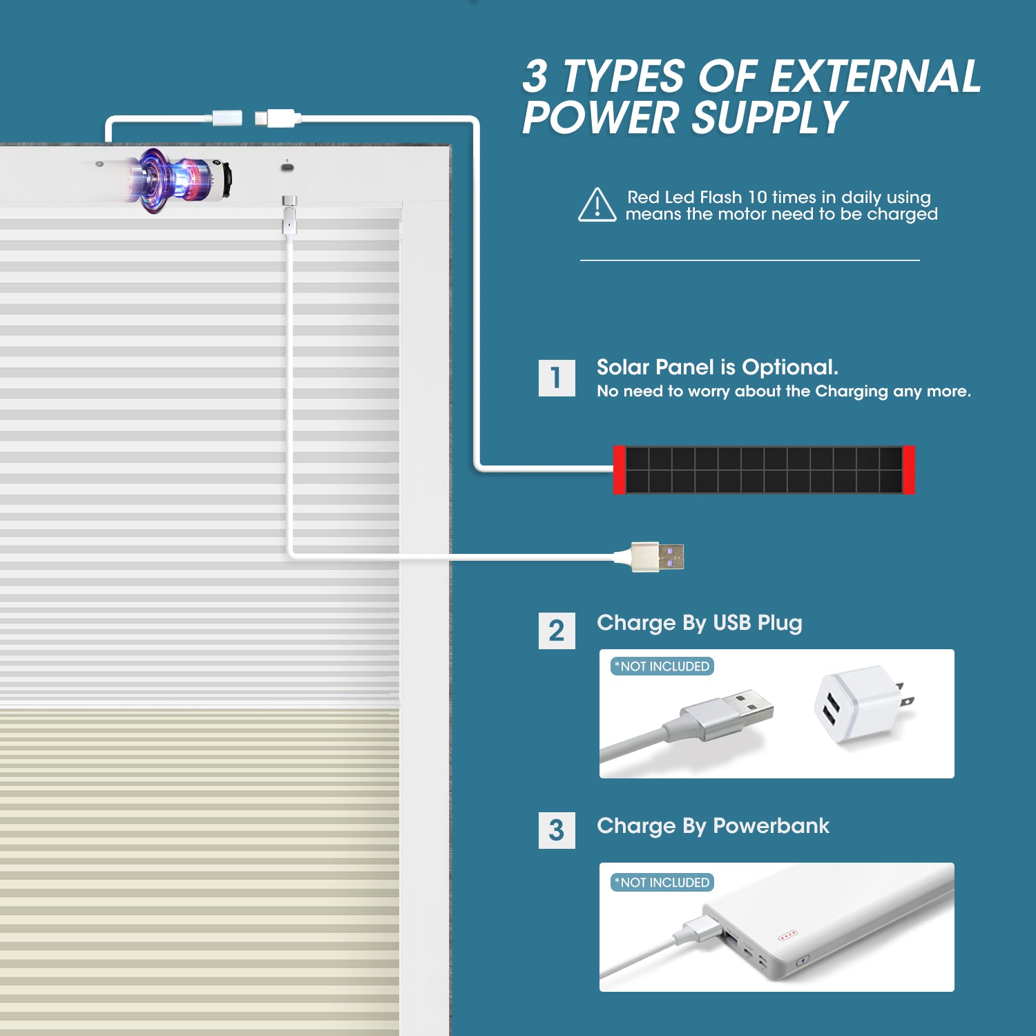 SmartWings shades feature a rechargeable motor that operates for 4-6 months on a full charge. Recharge them effortlessly using a Type-C cable or a solar panel for continuous convenience.