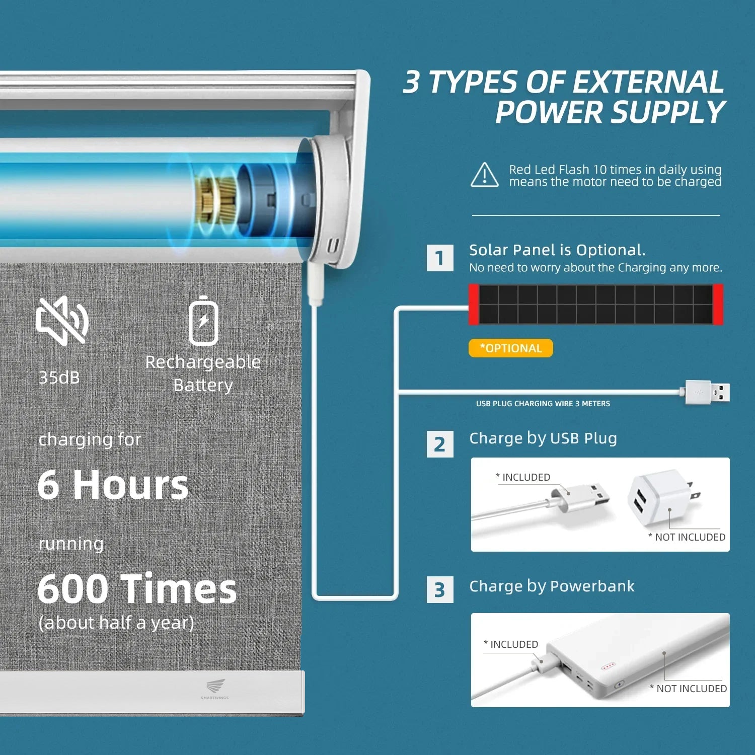 SmartWings shades feature a rechargeable motor that operates for 4-6 months on a full charge. Recharge them effortlessly using a Type-C cable or a solar panel for continuous convenience.