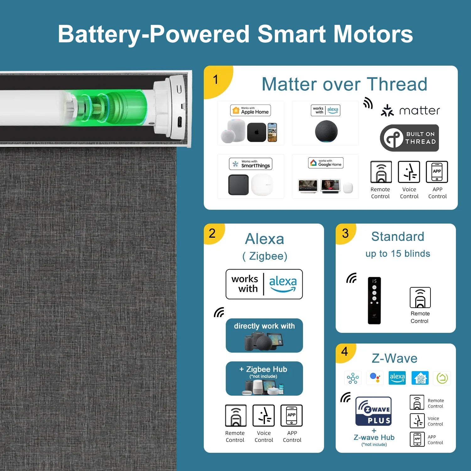 Explore our versatile range of motor options for smart shades, designed to integrate with various smart home platforms. Our Zigbee and Z-Wave motors are compatible with popular systems like Samsung SmartThings, Home Assistant, and Hubitat, ensuring easy integration and control.