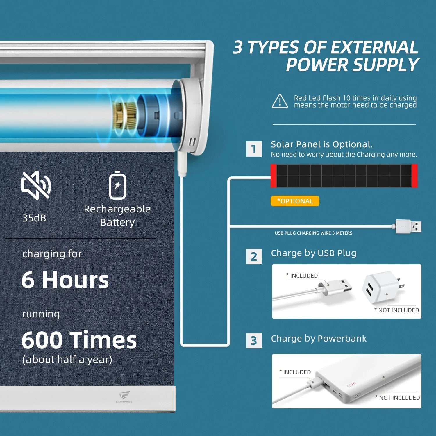 SmartWings shades feature a rechargeable motor that operates for 4-6 months on a full charge. Recharge them effortlessly using a Type-C cable or a solar panel for continuous convenience.