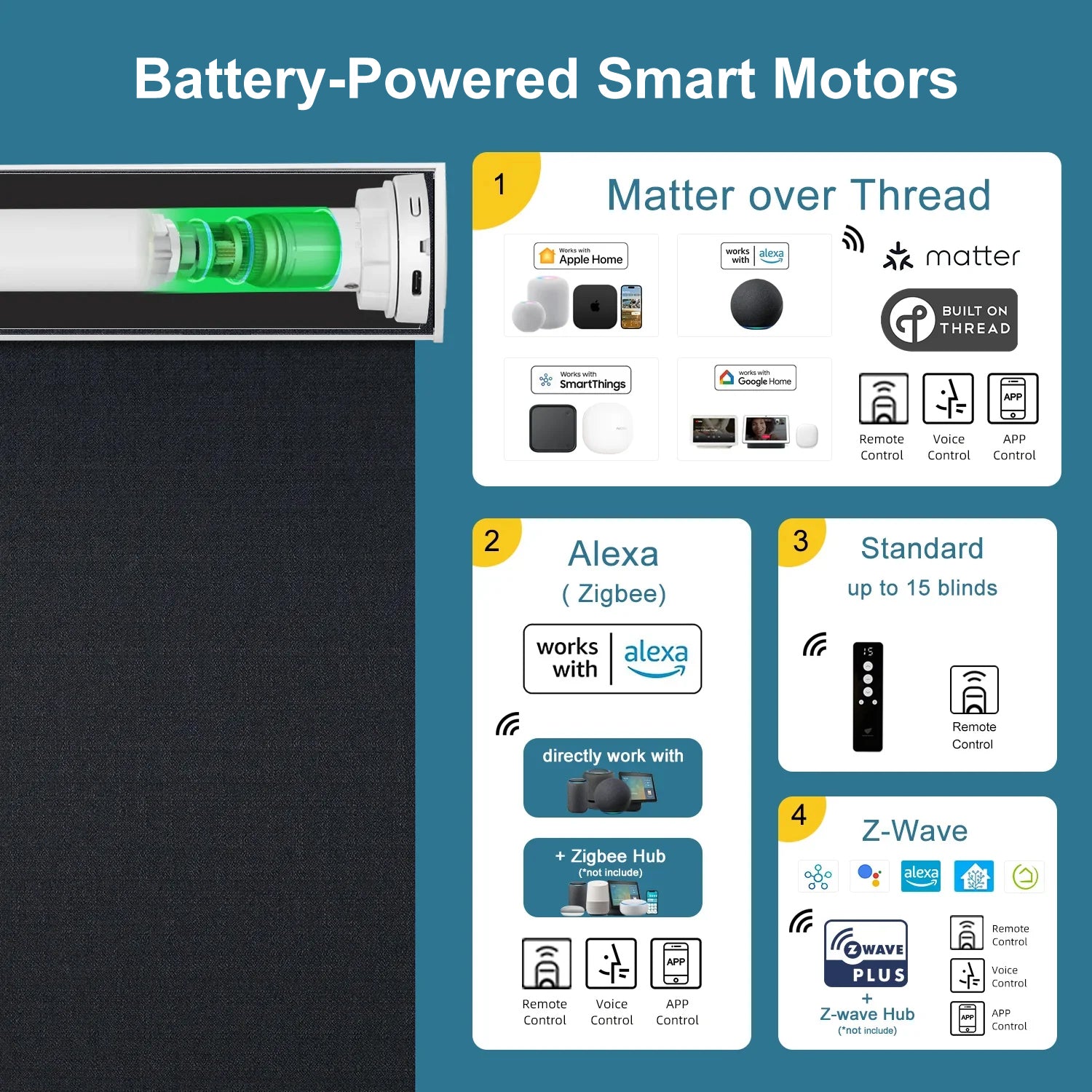 The highlight of our collection is the Matter motor, which represents the forefront of smart shade technology. Utilizing the Matter over Thread protocol, it seamlessly connects with major platforms such as Apple HomeKit, Amazon Alexa, Samsung SmartThings, and Google Assistant. This motor allows for intuitive control from your preferred app, providing faster response times, stable connections, and enhanced data security.