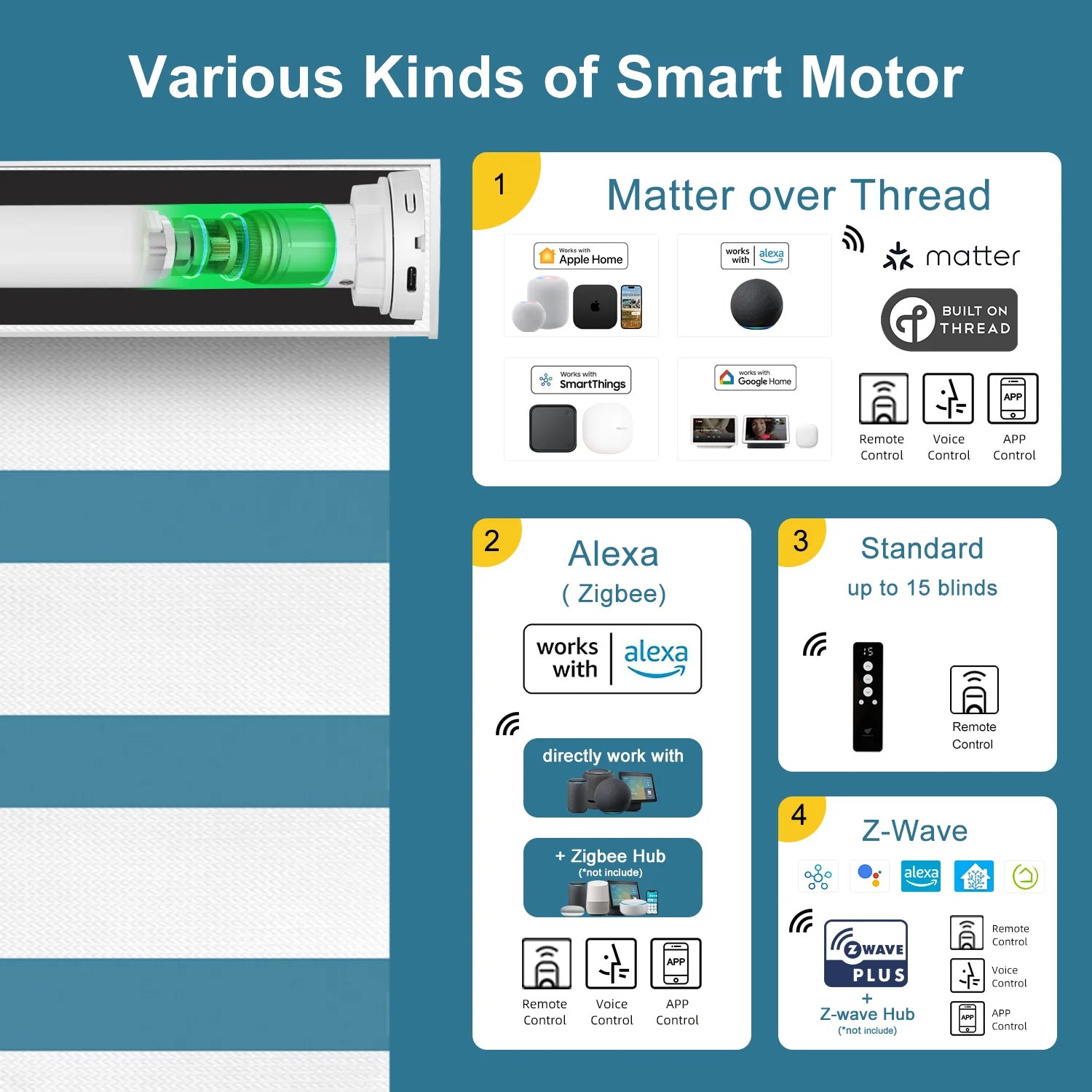 The highlight of our collection is the Matter motor, which represents the forefront of smart shade technology. Utilizing the Matter over Thread protocol, it seamlessly connects with major platforms such as Apple HomeKit, Amazon Alexa, Samsung SmartThings, and Google Assistant. This motor allows for intuitive control from your preferred app, providing faster response times, stable connections, and enhanced data security.