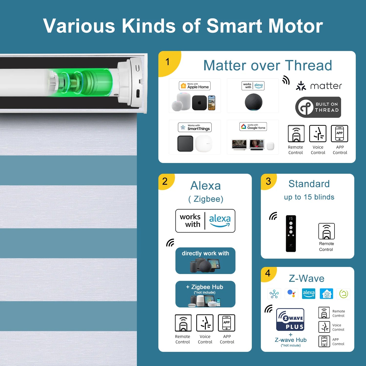 Explore our versatile range of motor options for smart shades, designed to integrate with various smart home platforms. Our Zigbee and Z-Wave motors are compatible with popular systems like Samsung SmartThings, Home Assistant, and Hubitat, ensuring easy integration and control.