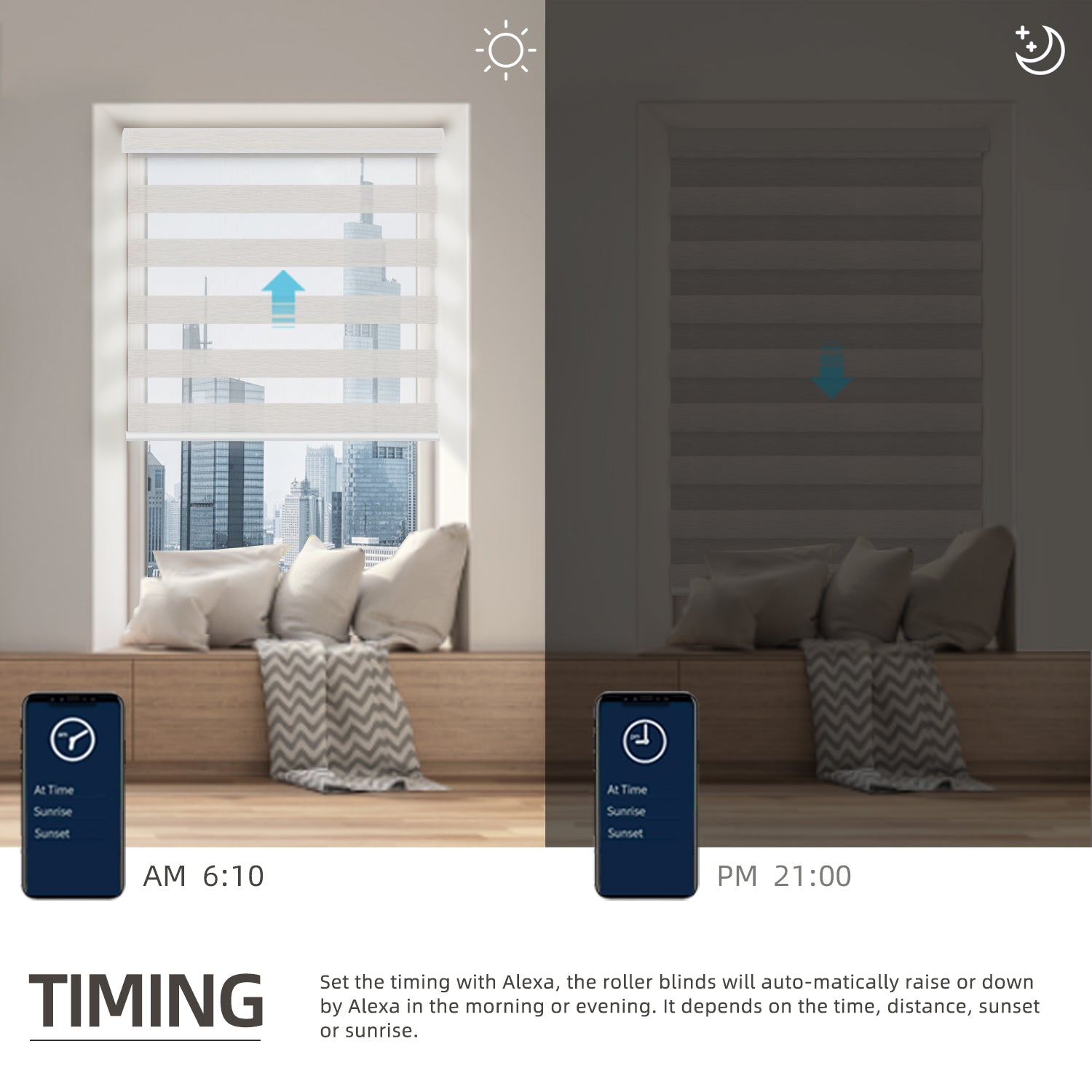 Explore the advanced features of our smart blinds, beyond just timed and group controls. Scene control customizes your shades for different activities – like automatically closing when you say 'Watching Movies'. Sync them with other Matter-certified devices for a seamless experience. The Sunrise/Sunset setting lets your shades rise with the morning sun and close at dusk, effortlessly aligning with your daily routine. Discover these and more functions to enhance your smart home experience.